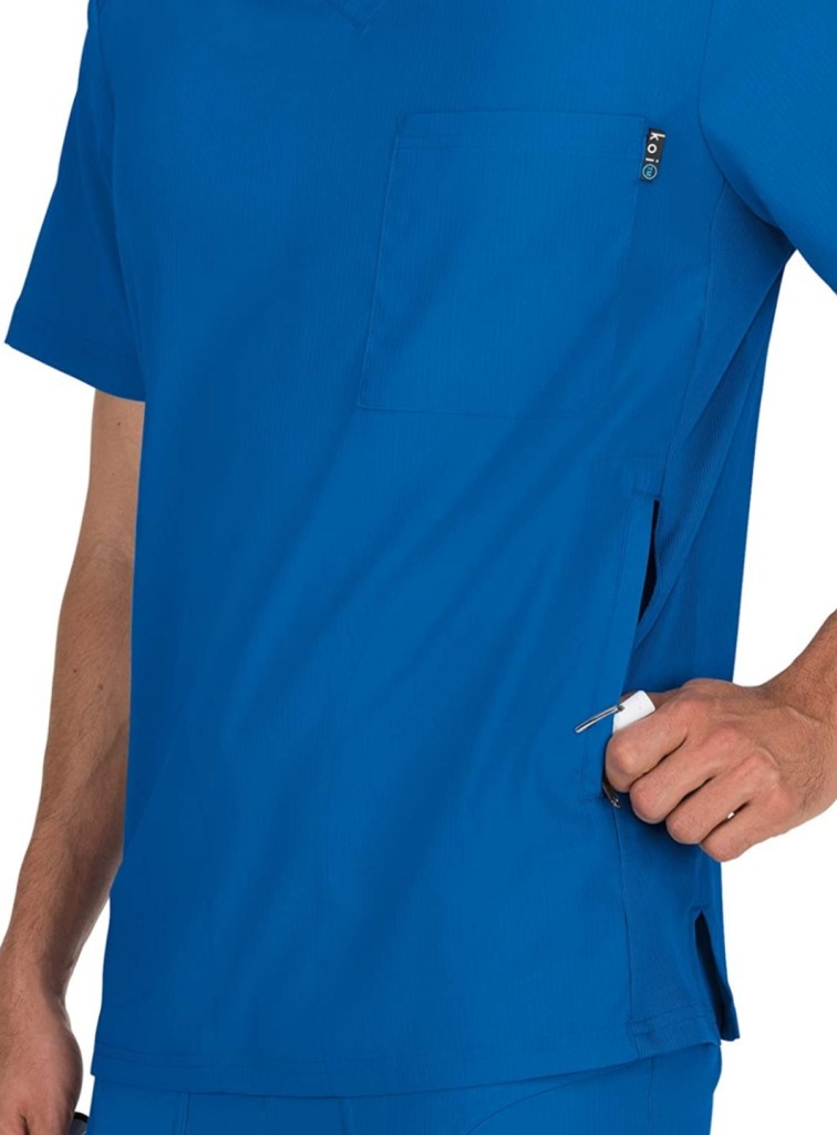 Corte Fit moderno | Cuello en V con aletilla interna. Bucle elástico en hombro para placa de identificación. Paneles laterales elásticos para mayor comodidad y ajuste | Bolsas con cierre de zipper.